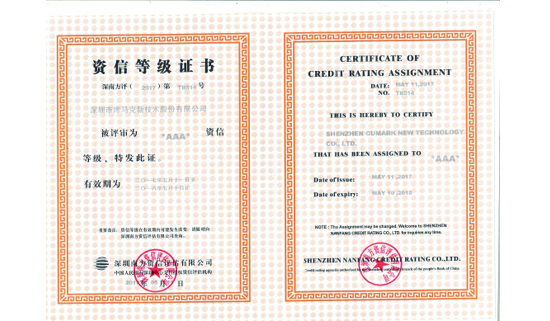 2017年5月11日,我司榮獲由深圳南方資信評(píng)估有限公司和中國(guó)人民銀行共同頒發(fā)的“AAA”級(jí)資信等級(jí)證書(shū),提升了企業(yè)品牌效應(yīng),提高了我司的企業(yè)市場(chǎng)競(jìng)爭(zhēng)力。
